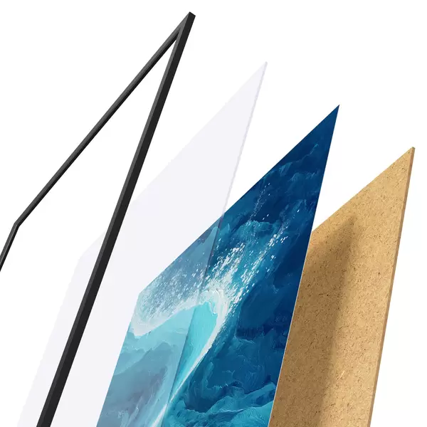A poszter keretből, plexiből, nyomtatott képből és forgácslap hátlapból áll. A poszter a hátoldalon található rögzítőknek köszönhetően azonnal felakasztható a falra.