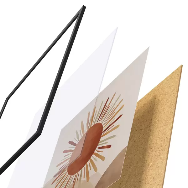 A poszter keretből, plexiből, nyomtatott képből és forgácslap hátlapból áll. A poszter a hátoldalon található rögzítőknek köszönhetően azonnal felakasztható a falra.