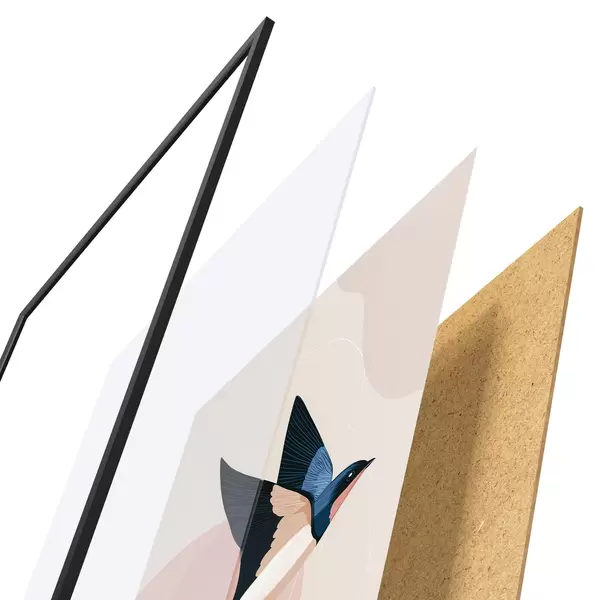 A poszter keretből, plexiből, nyomtatott képből és forgácslap hátlapból áll. A poszter a hátoldalon található rögzítőknek köszönhetően azonnal felakasztható a falra.