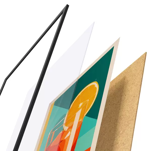 A poszter keretből, plexiből, nyomtatott képből és forgácslap hátlapból áll. A poszter a hátoldalon található rögzítőknek köszönhetően azonnal felakasztható a falra.