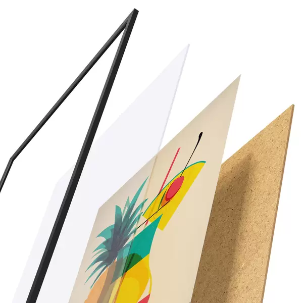 A poszter keretből, plexiből, nyomtatott képből és forgácslap hátlapból áll. A poszter a hátoldalon található rögzítőknek köszönhetően azonnal felakasztható a falra.