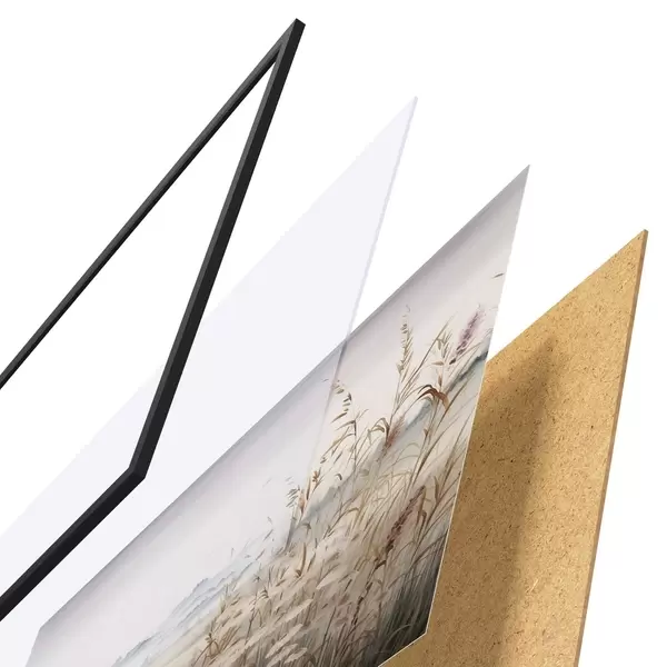 A poszter keretből, plexiből, nyomtatott képből és forgácslap hátlapból áll. A poszter a hátoldalon található rögzítőknek köszönhetően azonnal felakasztható a falra.