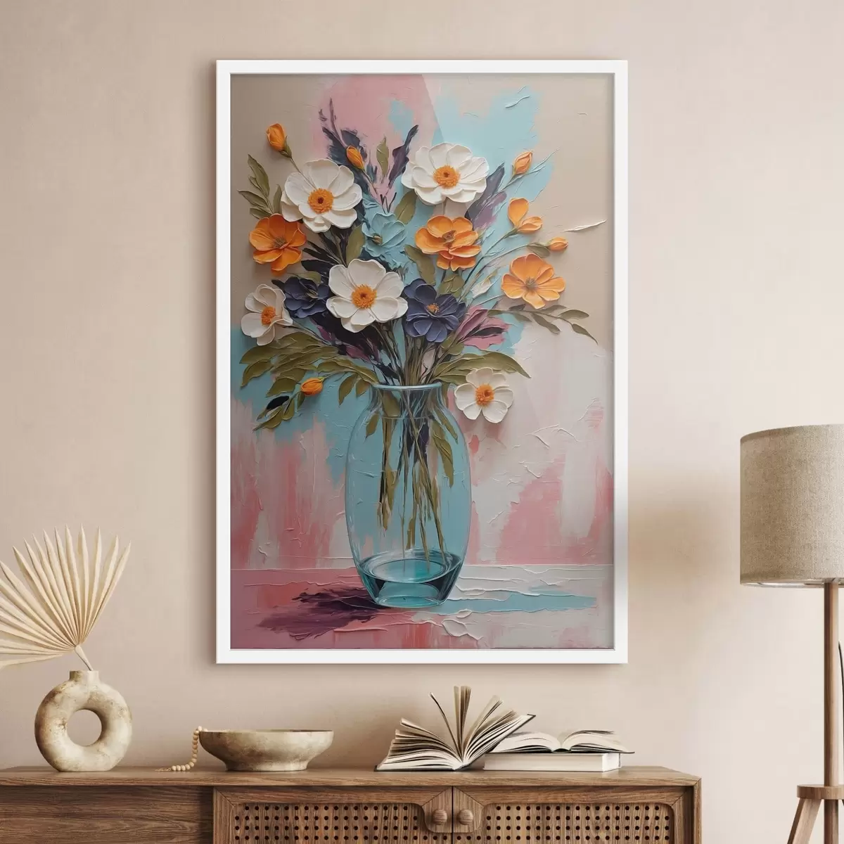 Plakát a sziklán Virágcsokor üvegvázában színes háttér előtt f48488
