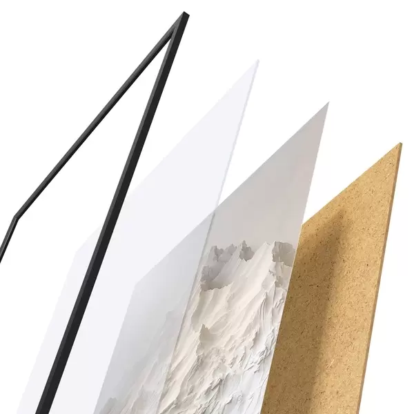 A poszter keretből, plexiből, nyomtatott képből és forgácslap hátlapból áll. A poszter a hátoldalon található rögzítőknek köszönhetően azonnal felakasztható a falra.