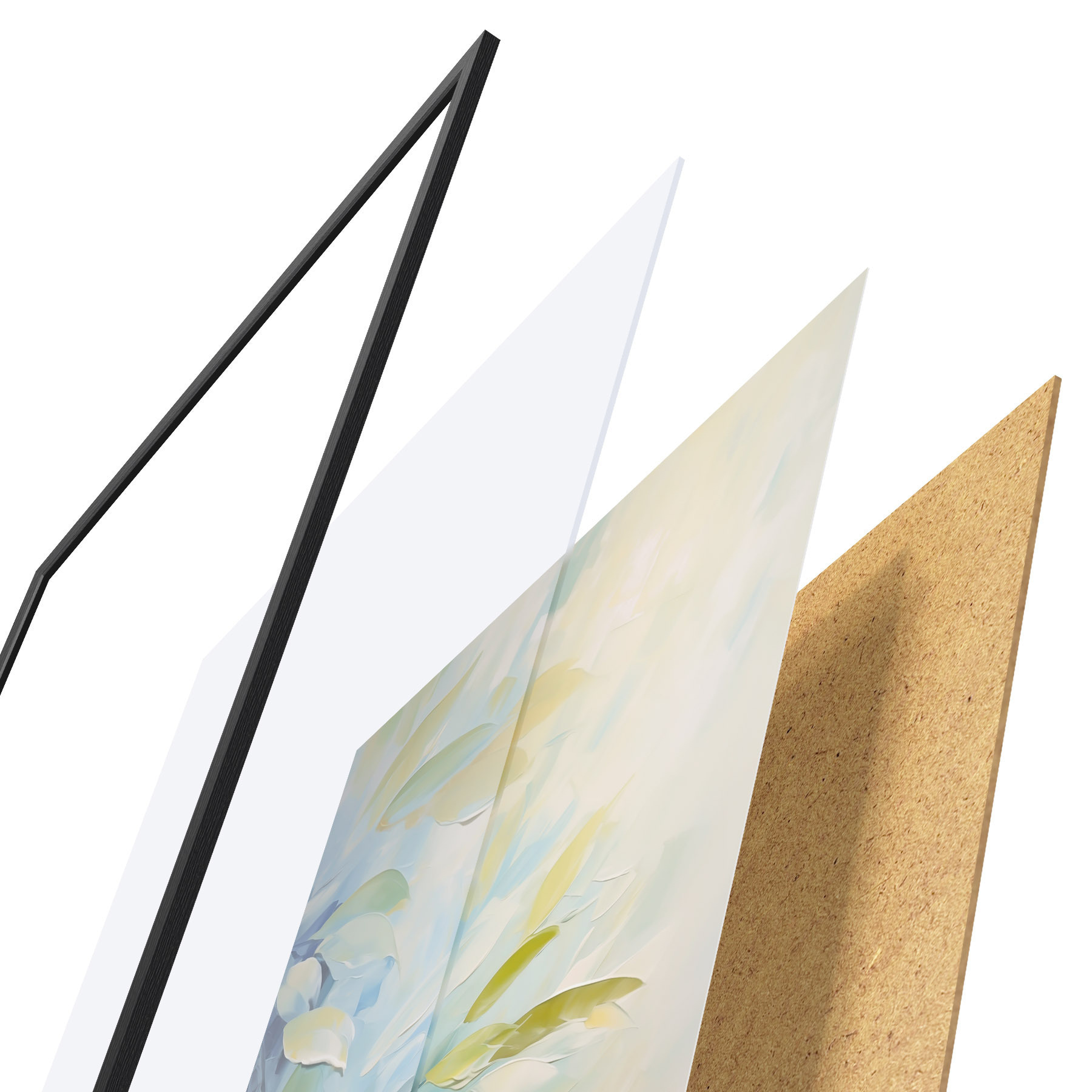 A poszter keretből, plexiből, nyomtatott képből és forgácslap hátlapból áll. A poszter a hátoldalon található rögzítőknek köszönhetően azonnal felakasztható a falra.