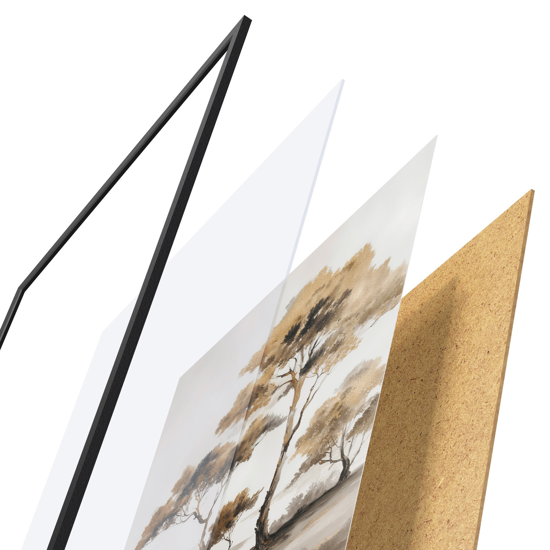 A poszter keretből, plexiből, nyomtatott képből és forgácslap hátlapból áll. A poszter a hátoldalon található rögzítőknek köszönhetően azonnal felakasztható a falra.