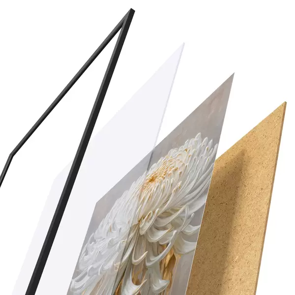 A poszter keretből, plexiből, nyomtatott képből és forgácslap hátlapból áll. A poszter a hátoldalon található rögzítőknek köszönhetően azonnal felakasztható a falra.