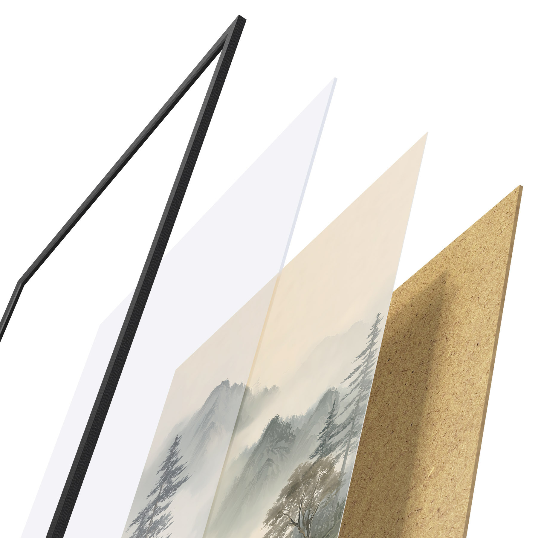 A poszter keretből, plexiből, nyomtatott képből és forgácslap hátlapból áll. A poszter a hátoldalon található rögzítőknek köszönhetően azonnal felakasztható a falra.