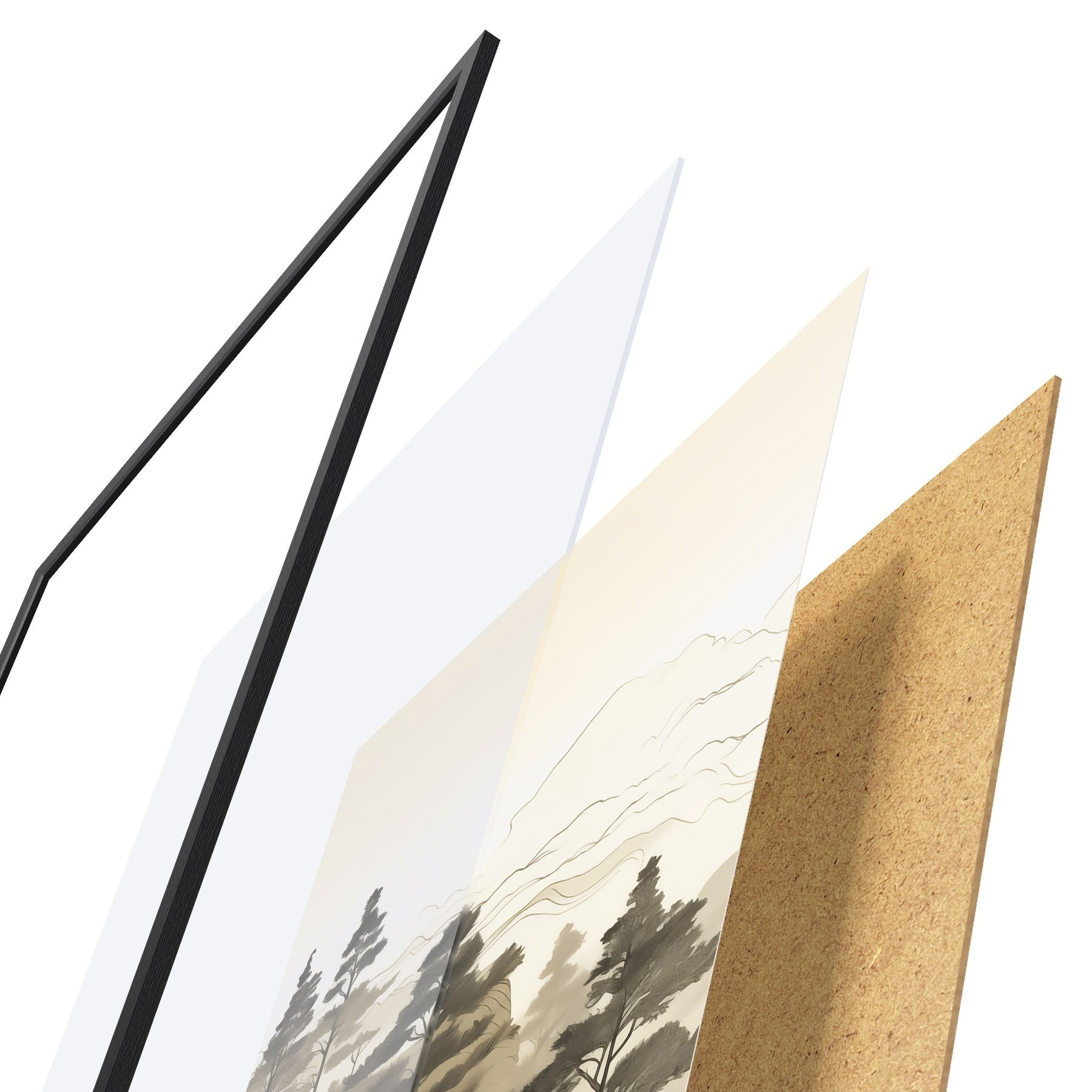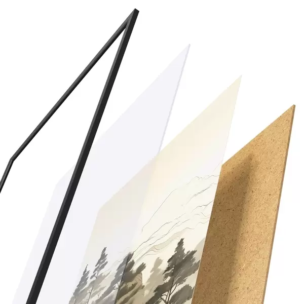 A poszter keretből, plexiből, nyomtatott képből és forgácslap hátlapból áll. A poszter a hátoldalon található rögzítőknek köszönhetően azonnal felakasztható a falra.