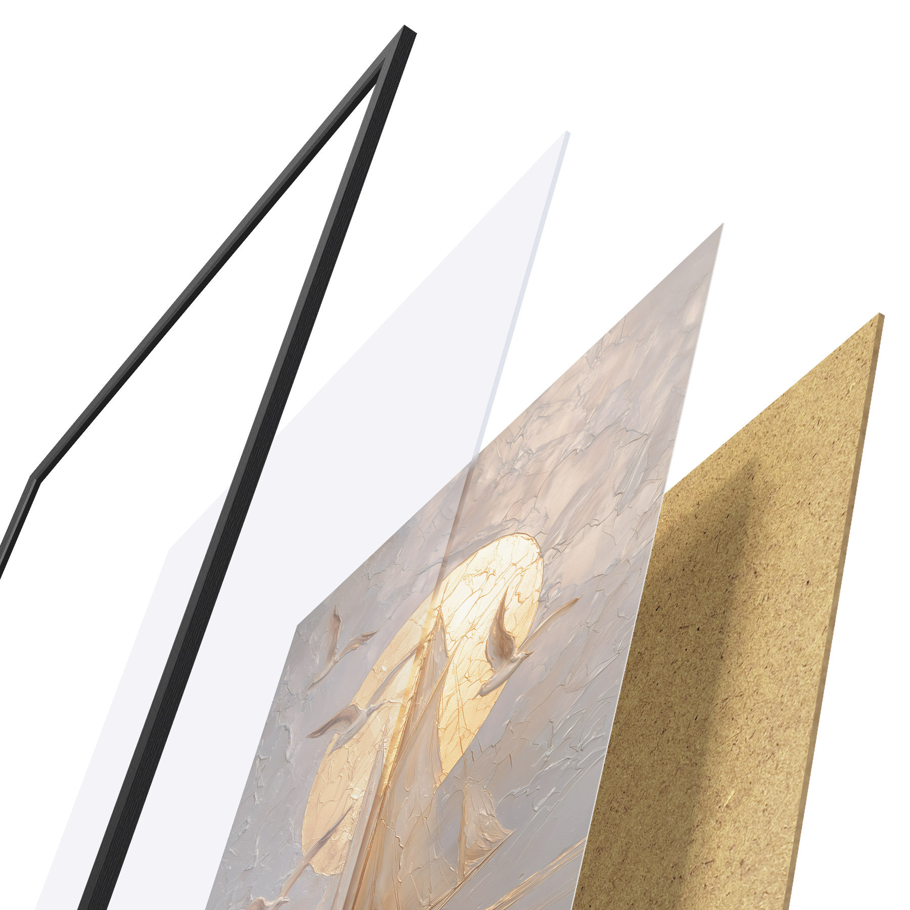 A poszter keretből, plexiből, nyomtatott képből és forgácslap hátlapból áll. A poszter a hátoldalon található rögzítőknek köszönhetően azonnal felakasztható a falra.