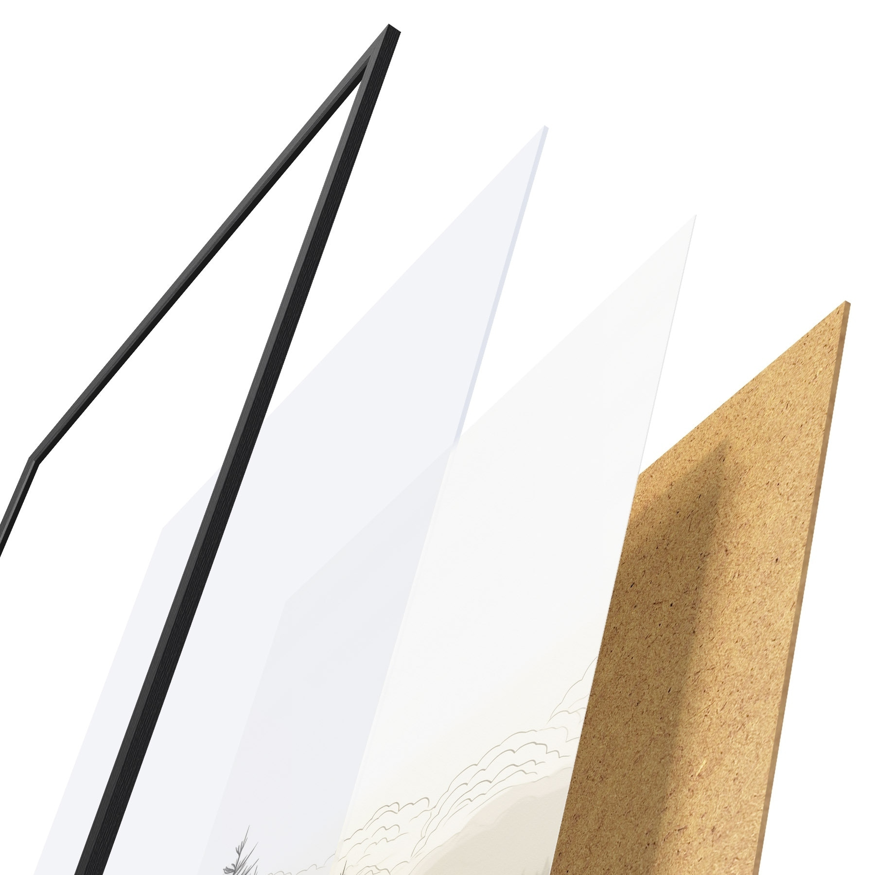 A poszter keretből, plexiből, nyomtatott képből és forgácslap hátlapból áll. A poszter a hátoldalon található rögzítőknek köszönhetően azonnal felakasztható a falra.