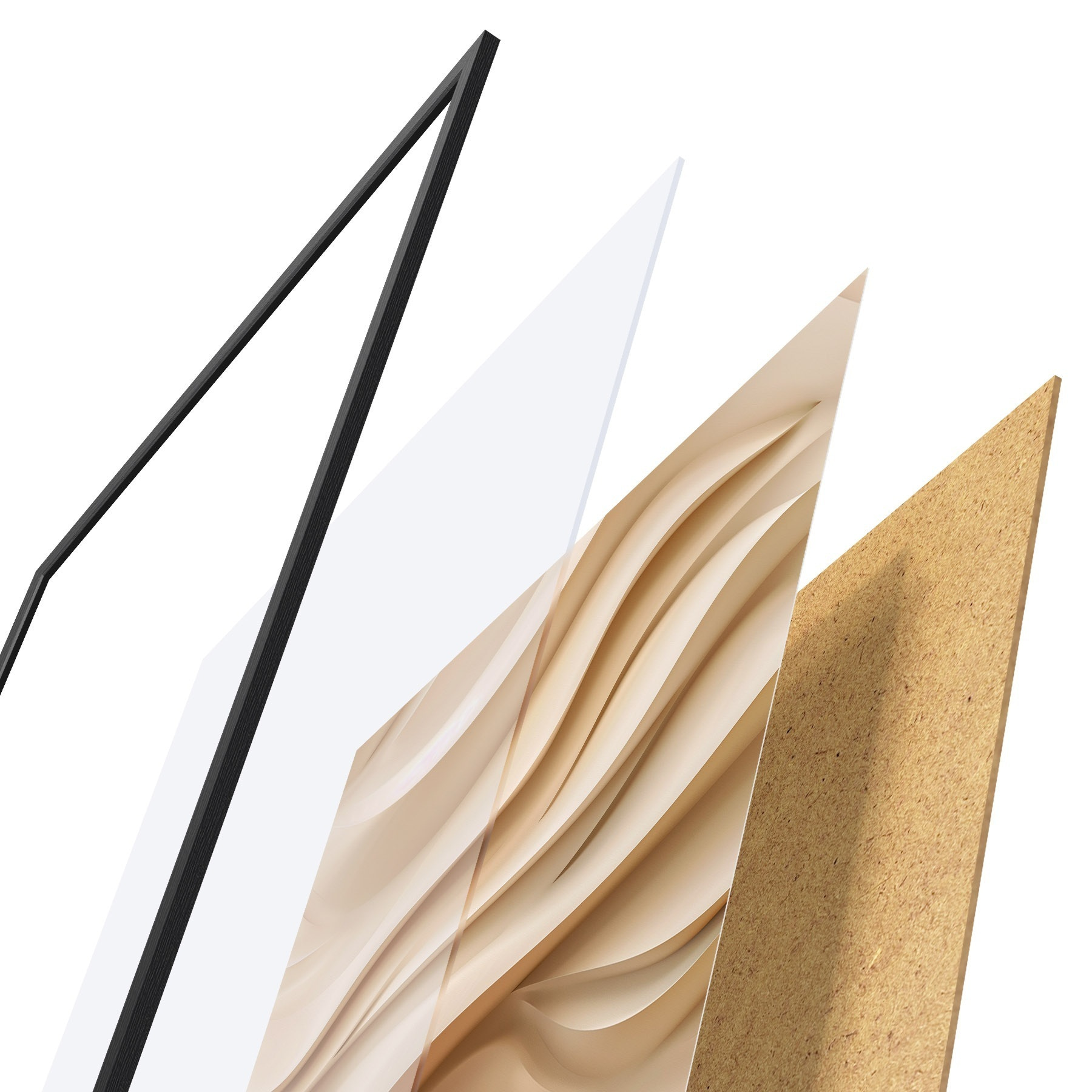 A poszter keretből, plexiből, nyomtatott képből és forgácslap hátlapból áll. A poszter a hátoldalon található rögzítőknek köszönhetően azonnal felakasztható a falra.