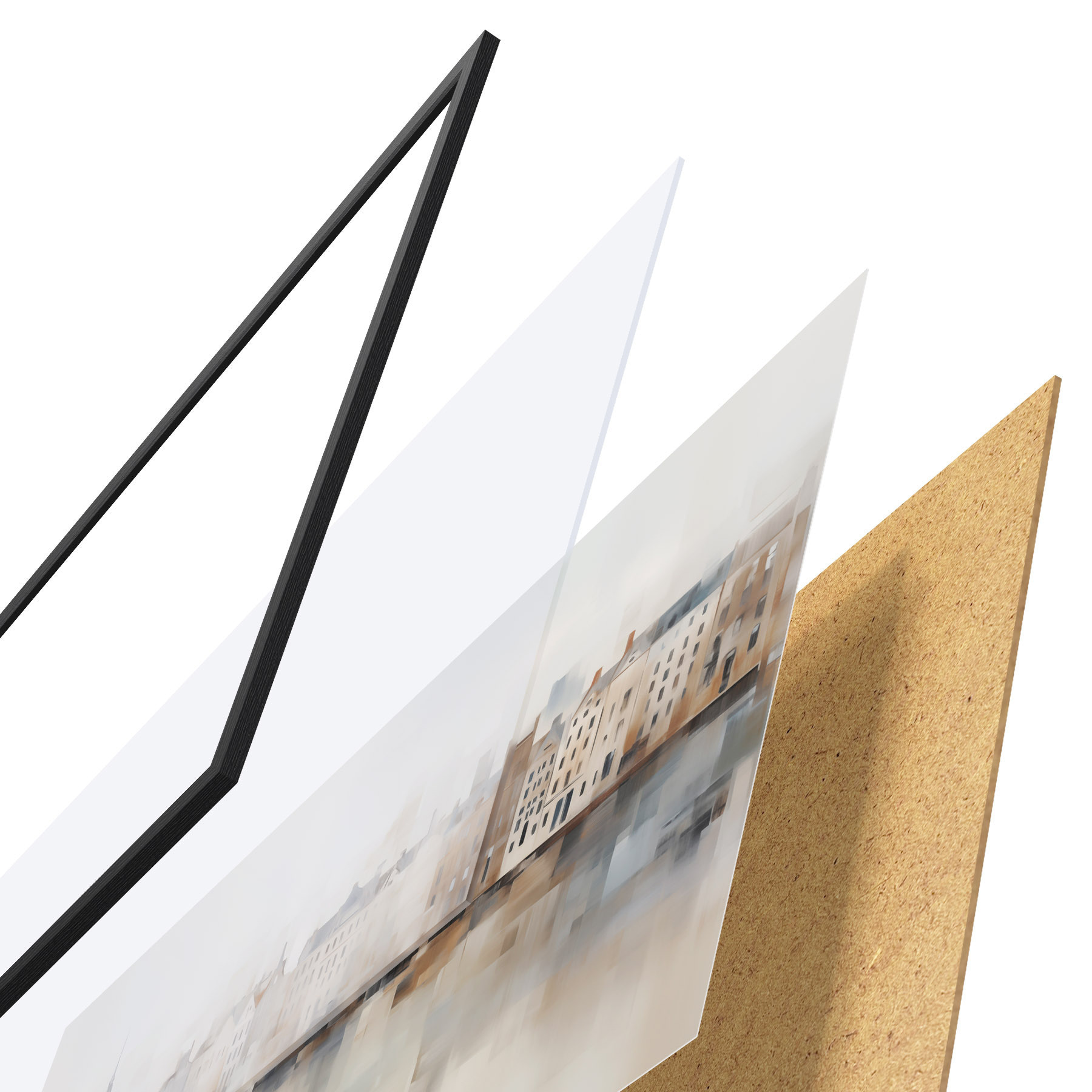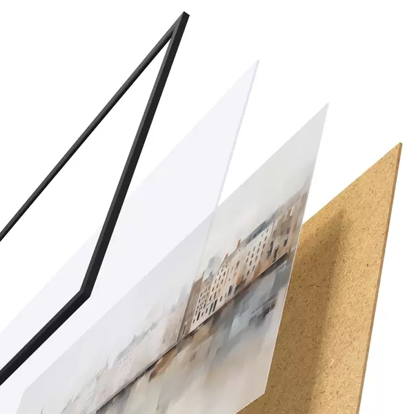 A poszter keretből, plexiből, nyomtatott képből és forgácslap hátlapból áll. A poszter a hátoldalon található rögzítőknek köszönhetően azonnal felakasztható a falra.