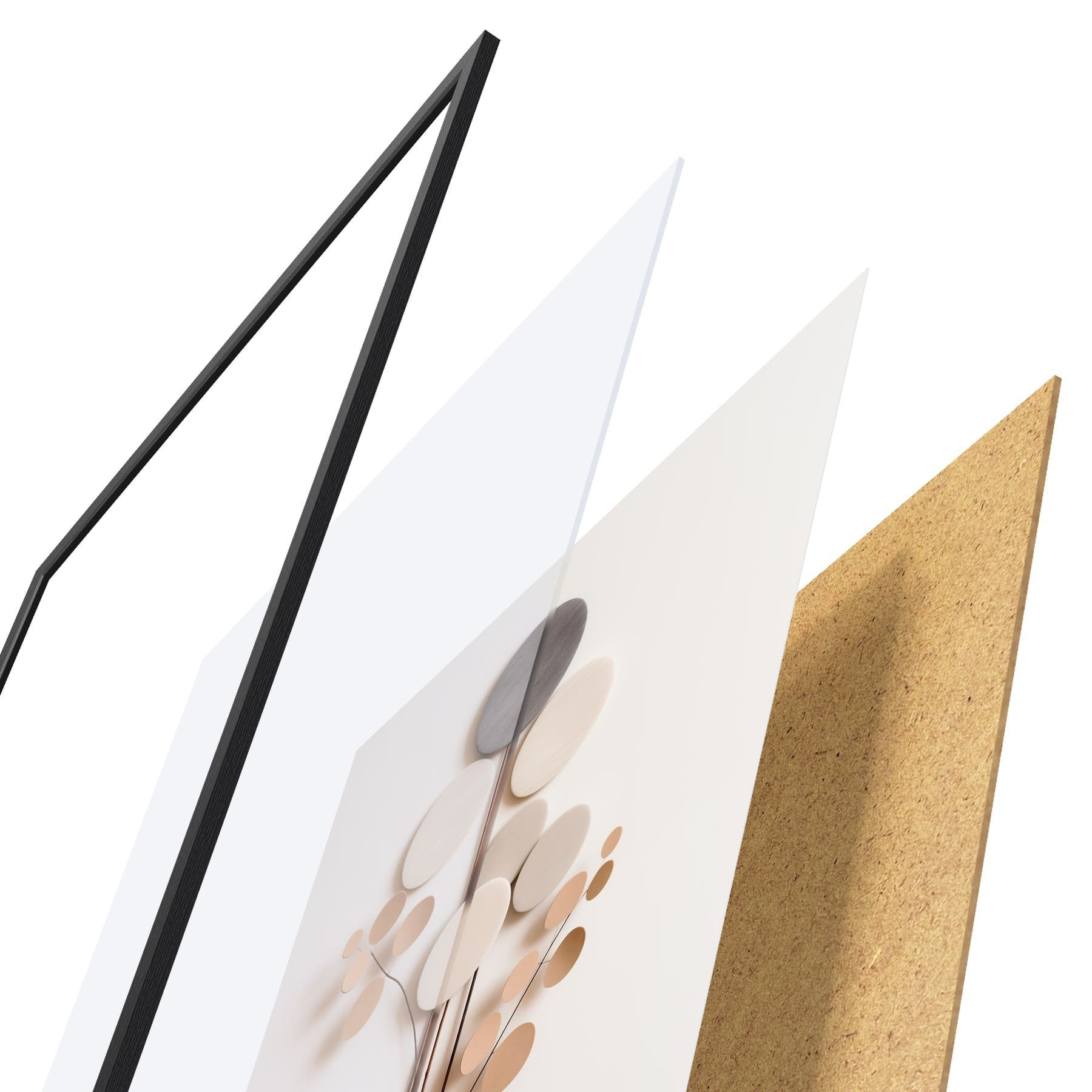 A poszter keretből, plexiből, nyomtatott képből és forgácslap hátlapból áll. A poszter a hátoldalon található rögzítőknek köszönhetően azonnal felakasztható a falra.