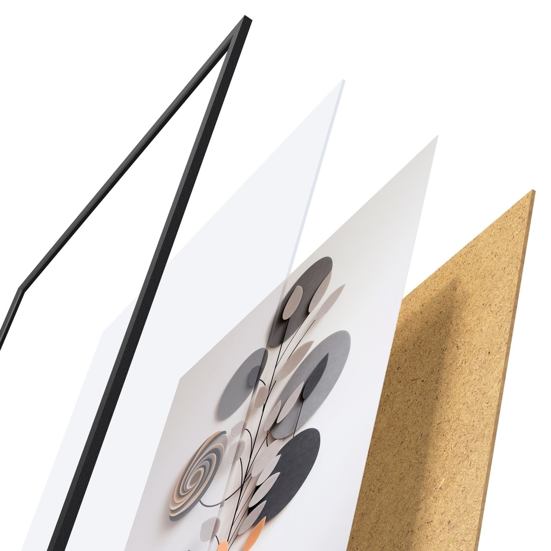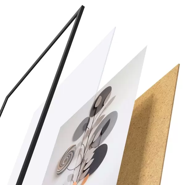 A poszter keretből, plexiből, nyomtatott képből és forgácslap hátlapból áll. A poszter a hátoldalon található rögzítőknek köszönhetően azonnal felakasztható a falra.