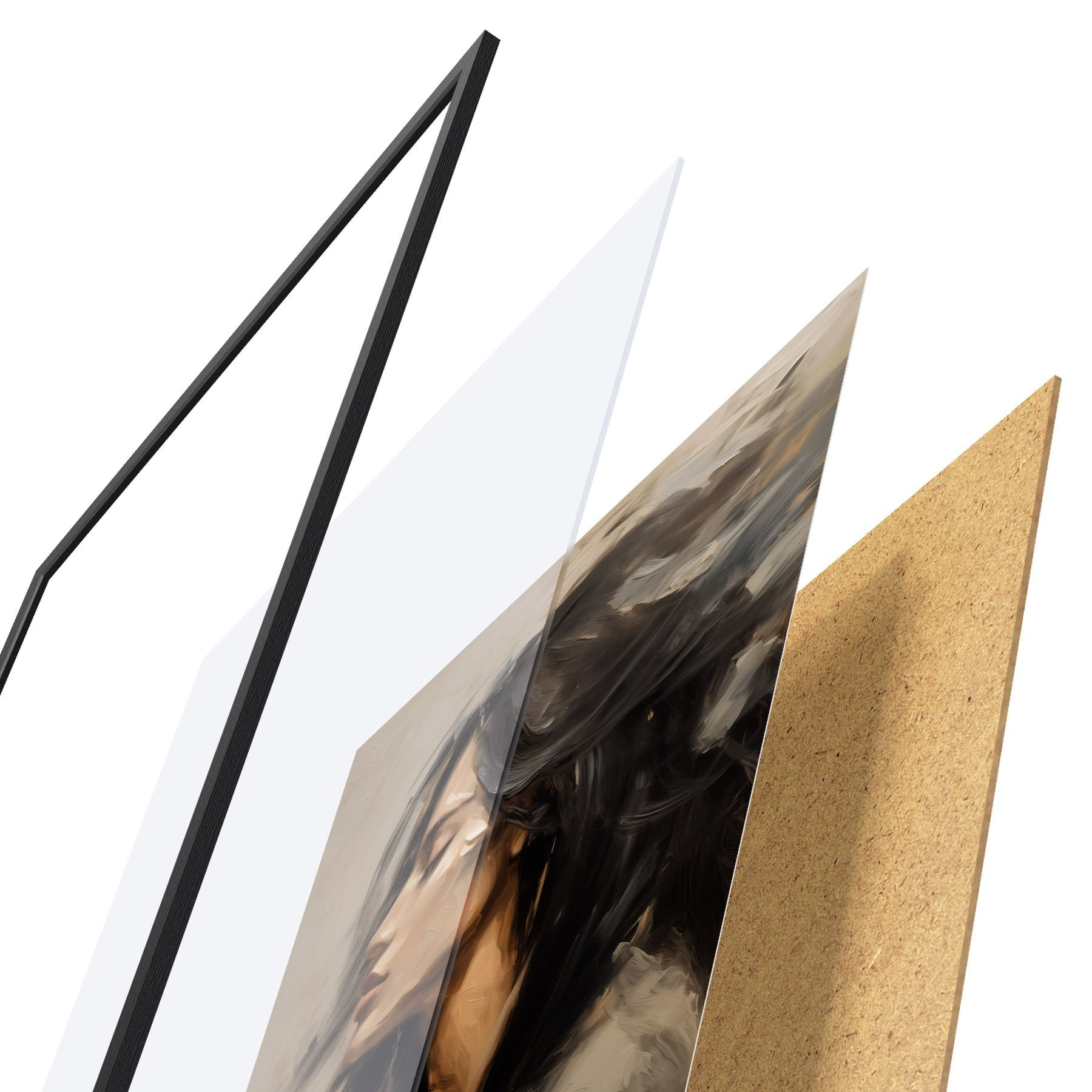 A poszter keretből, plexiből, nyomtatott képből és forgácslap hátlapból áll. A poszter a hátoldalon található rögzítőknek köszönhetően azonnal felakasztható a falra.