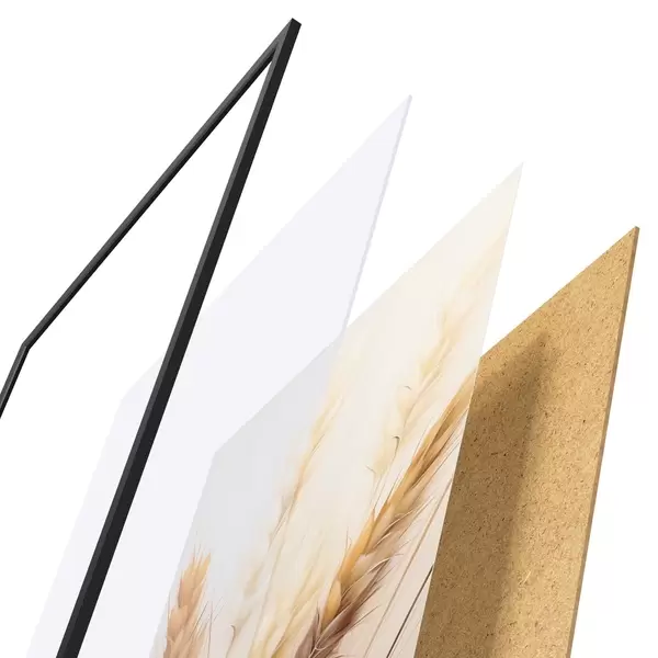 A poszter keretből, plexiből, nyomtatott képből és forgácslap hátlapból áll. A poszter a hátoldalon található rögzítőknek köszönhetően azonnal felakasztható a falra.