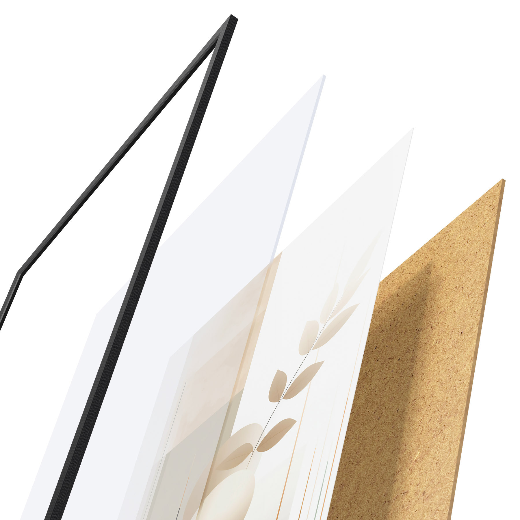 A poszter keretből, plexiből, nyomtatott képből és forgácslap hátlapból áll. A poszter a hátoldalon található rögzítőknek köszönhetően azonnal felakasztható a falra.