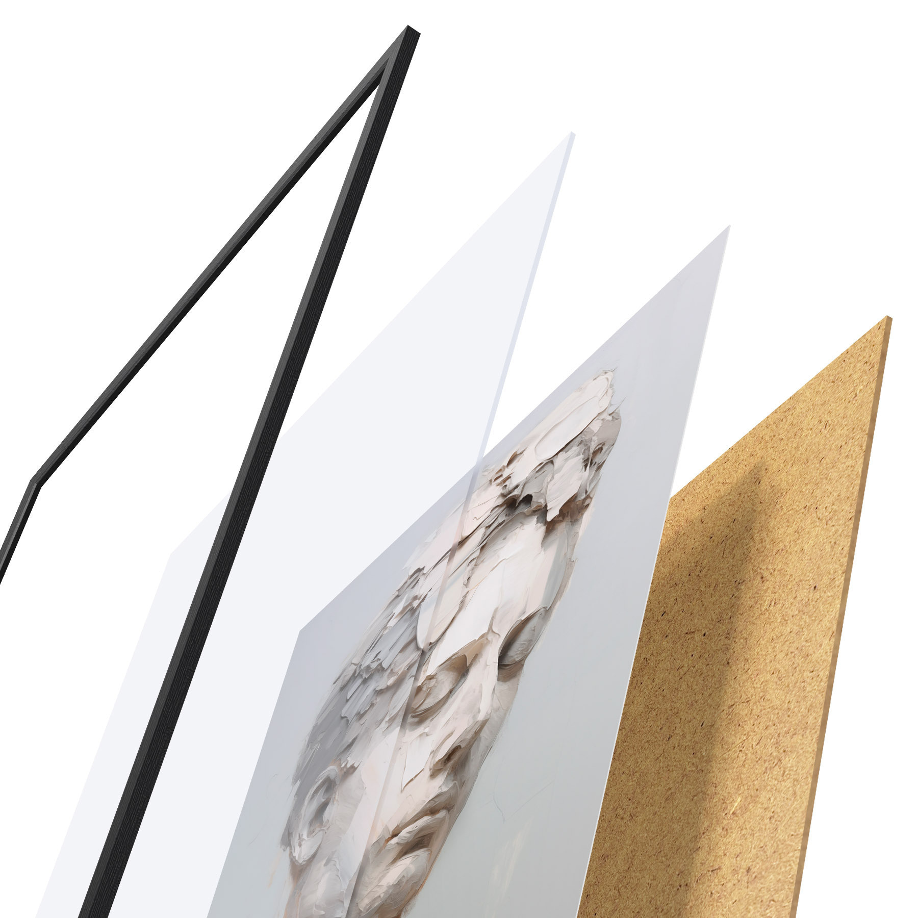 A poszter keretből, plexiből, nyomtatott képből és forgácslap hátlapból áll. A poszter a hátoldalon található rögzítőknek köszönhetően azonnal felakasztható a falra.