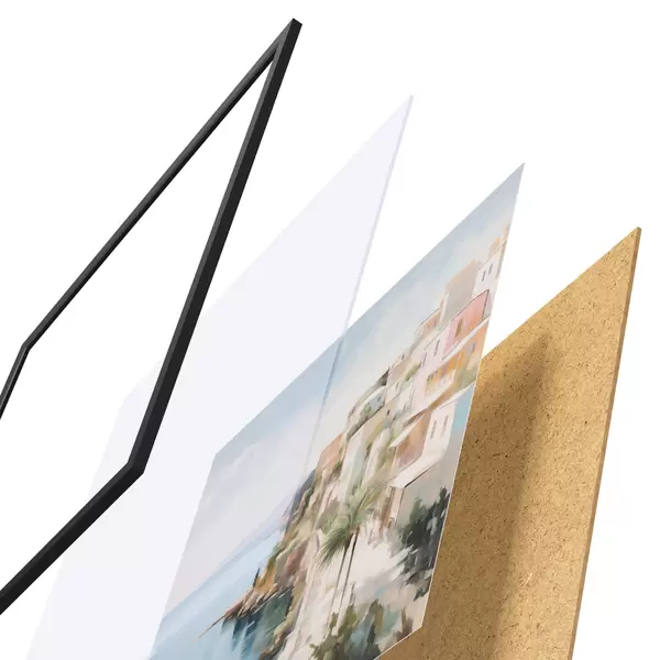 A poszter keretből, plexiből, nyomtatott képből és forgácslap hátlapból áll. A poszter a hátoldalon található rögzítőknek köszönhetően azonnal felakasztható a falra.