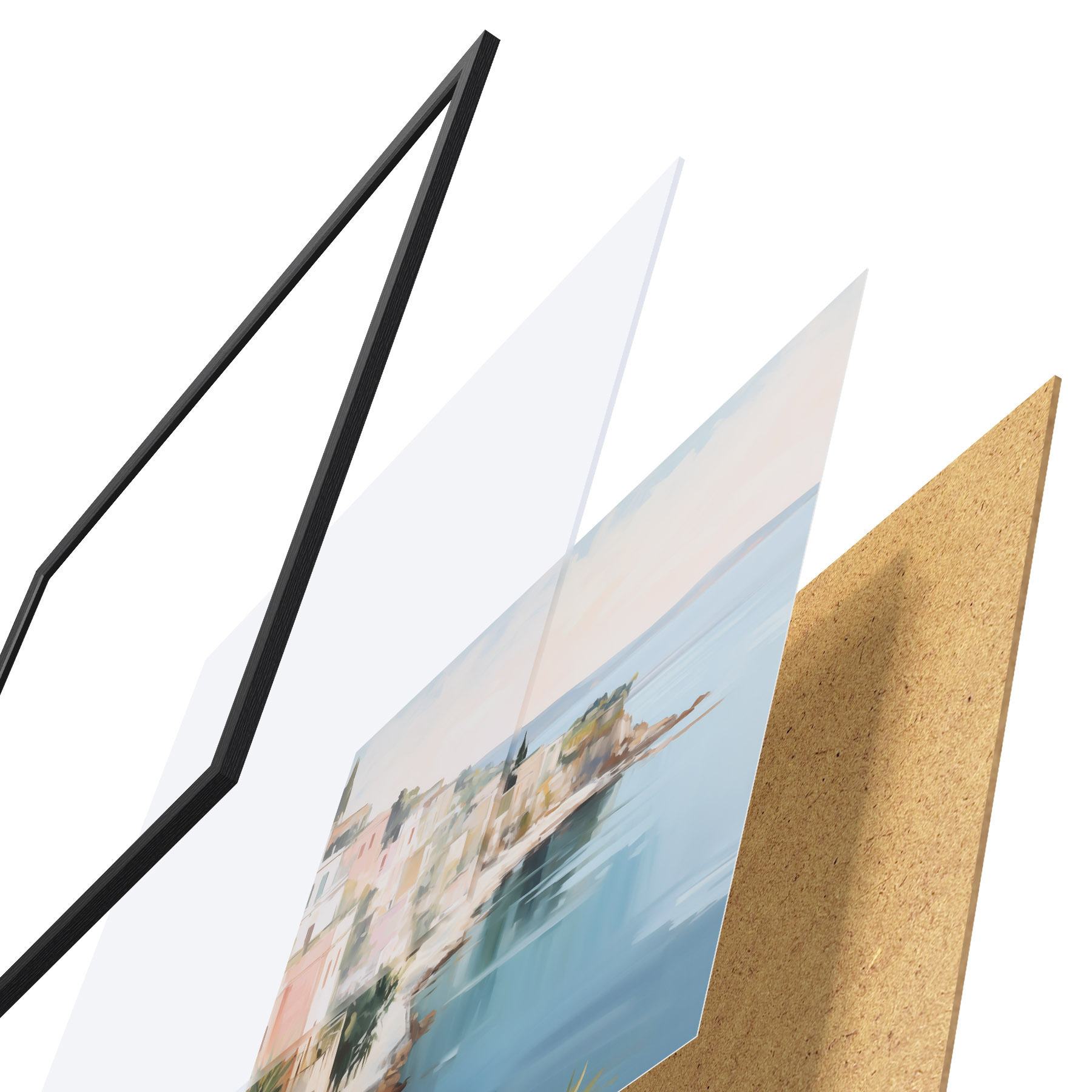 A poszter keretből, plexiből, nyomtatott képből és forgácslap hátlapból áll. A poszter a hátoldalon található rögzítőknek köszönhetően azonnal felakasztható a falra.