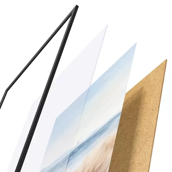 A poszter keretből, plexiből, nyomtatott képből és forgácslap hátlapból áll. A poszter a hátoldalon található rögzítőknek köszönhetően azonnal felakasztható a falra.