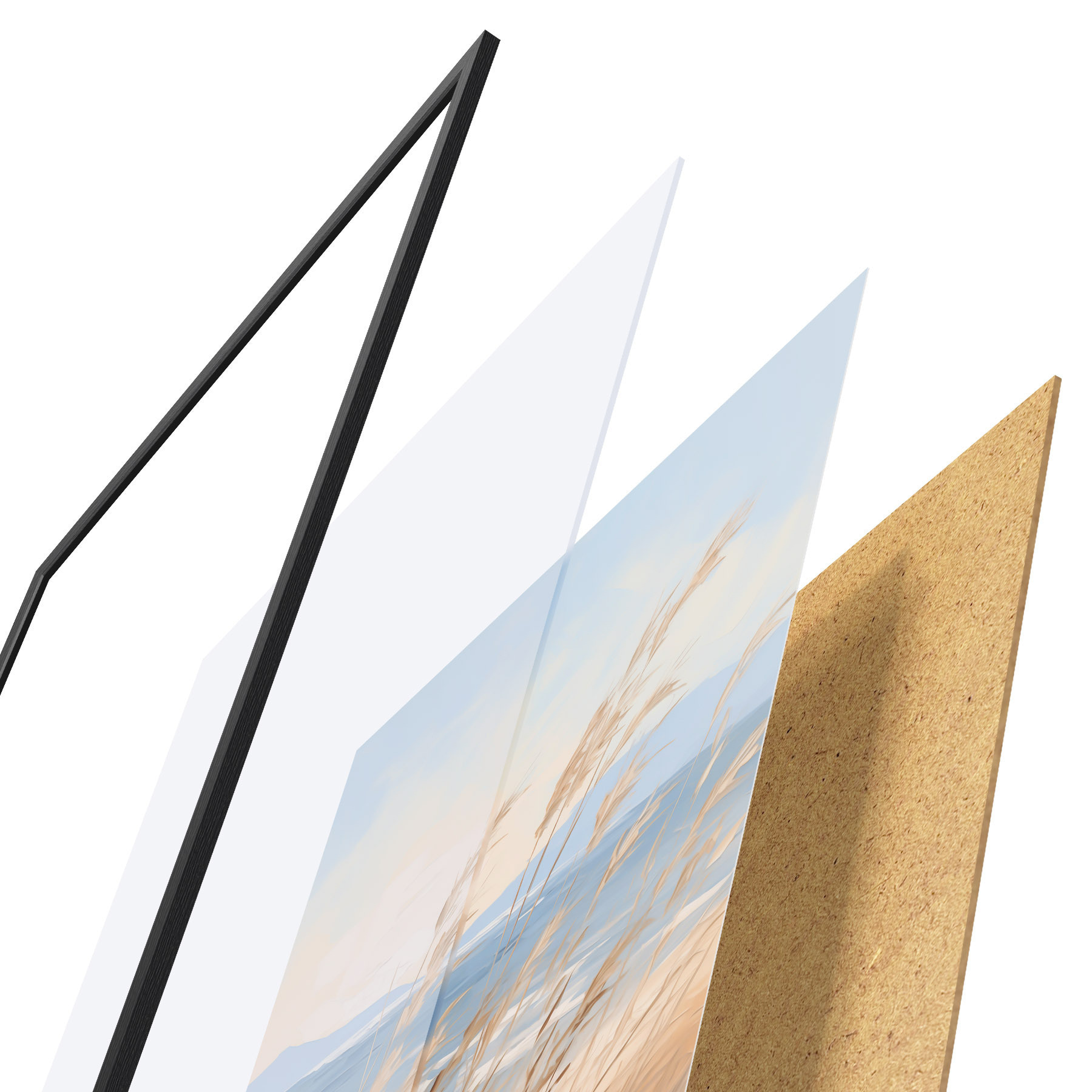 A poszter keretből, plexiből, nyomtatott képből és forgácslap hátlapból áll. A poszter a hátoldalon található rögzítőknek köszönhetően azonnal felakasztható a falra.
