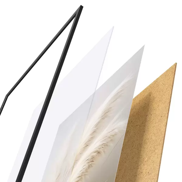 A poszter keretből, plexiből, nyomtatott képből és forgácslap hátlapból áll. A poszter a hátoldalon található rögzítőknek köszönhetően azonnal felakasztható a falra.