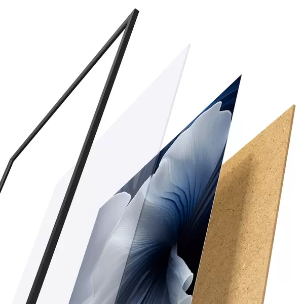 A poszter keretből, plexiből, nyomtatott képből és forgácslap hátlapból áll. A poszter a hátoldalon található rögzítőknek köszönhetően azonnal felakasztható a falra.