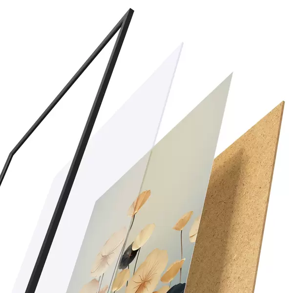 A poszter keretből, plexiből, nyomtatott képből és forgácslap hátlapból áll. A poszter a hátoldalon található rögzítőknek köszönhetően azonnal felakasztható a falra.
