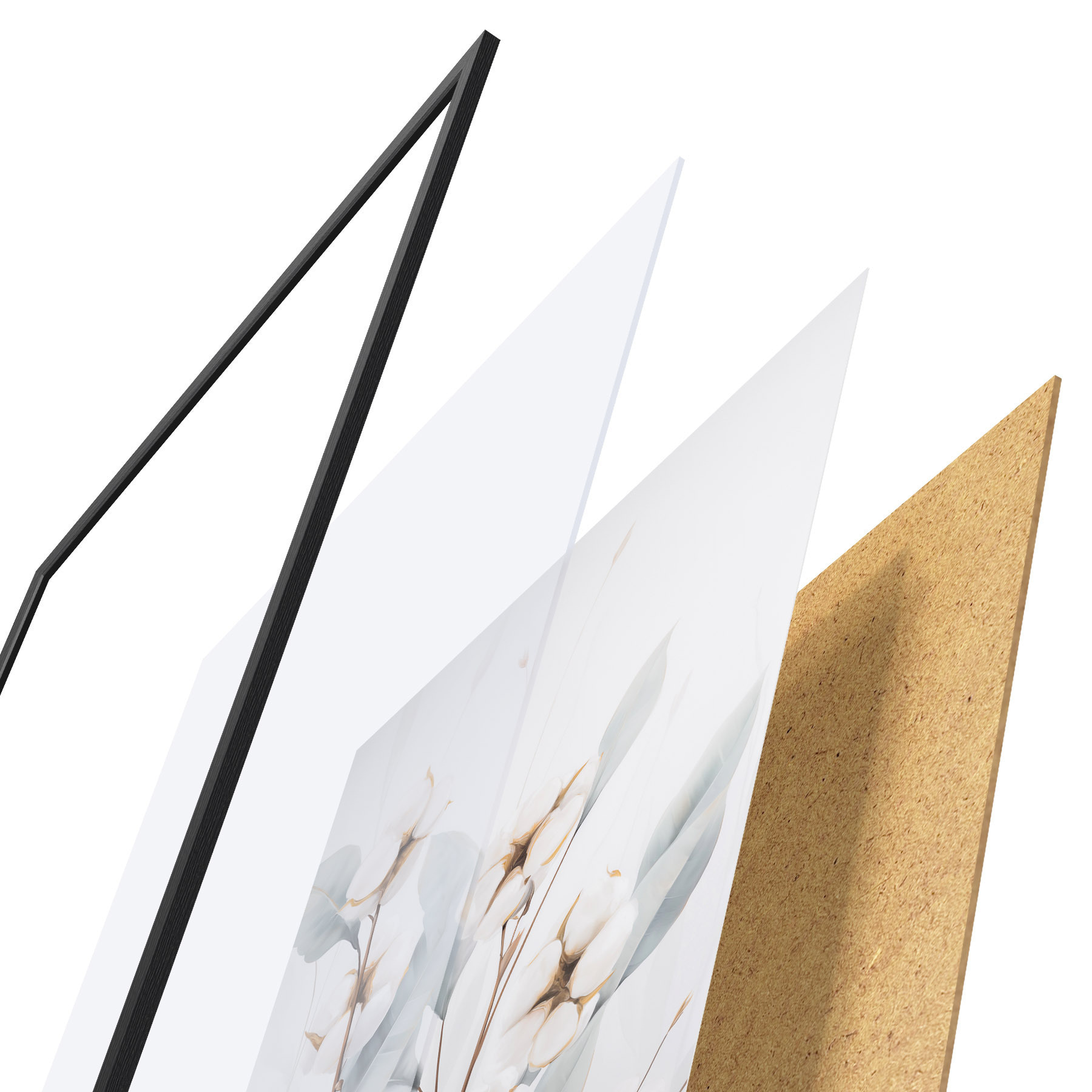 A poszter keretből, plexiből, nyomtatott képből és forgácslap hátlapból áll. A poszter a hátoldalon található rögzítőknek köszönhetően azonnal felakasztható a falra.