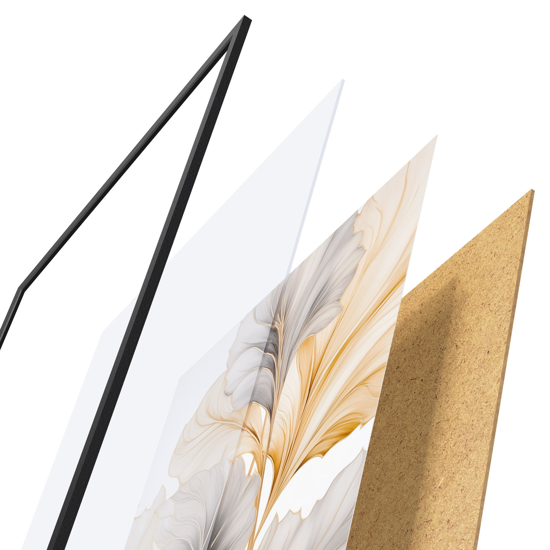A poszter keretből, plexiből, nyomtatott képből és forgácslap hátlapból áll. A poszter a hátoldalon található rögzítőknek köszönhetően azonnal felakasztható a falra.