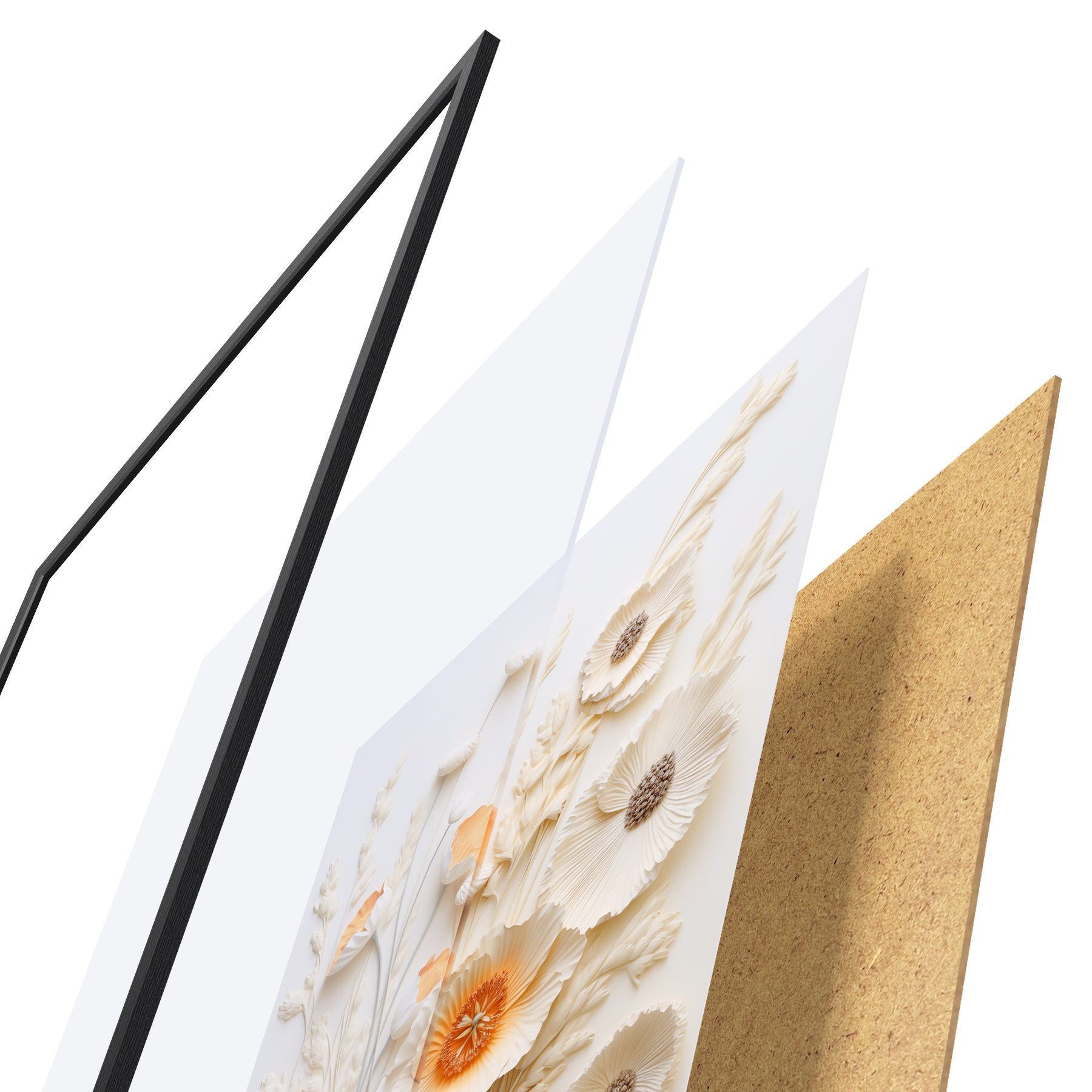 A poszter keretből, plexiből, nyomtatott képből és forgácslap hátlapból áll. A poszter a hátoldalon található rögzítőknek köszönhetően azonnal felakasztható a falra.