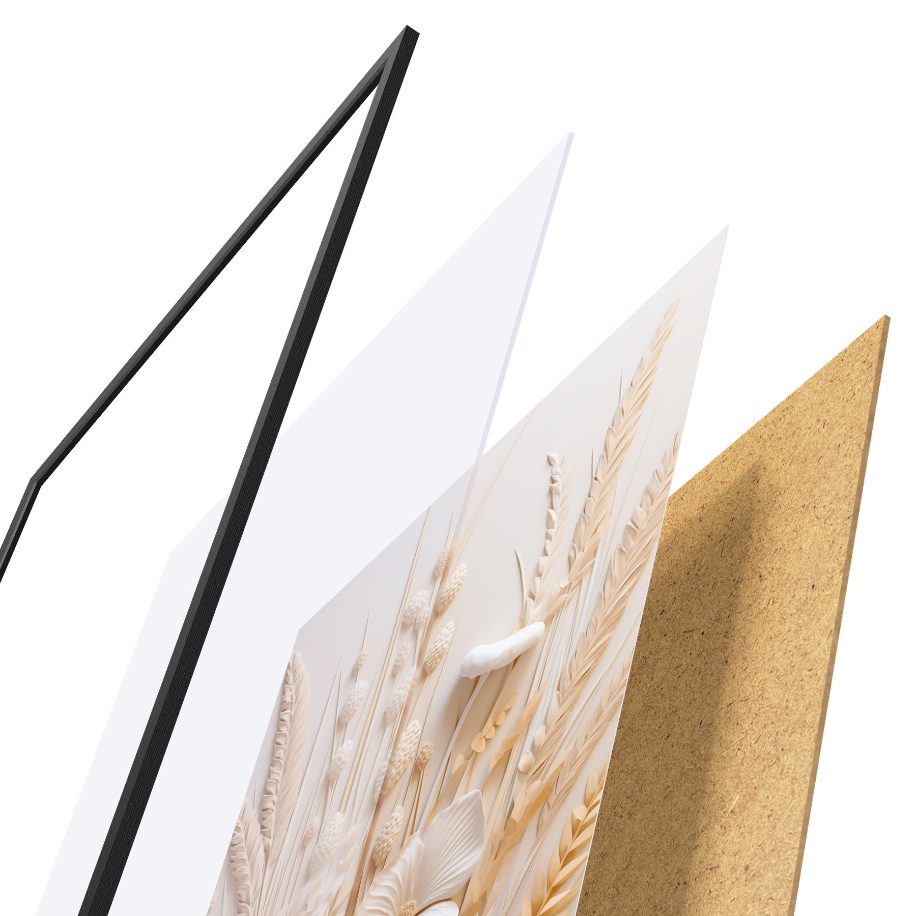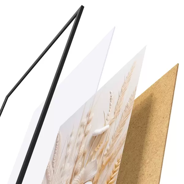 A poszter keretből, plexiből, nyomtatott képből és forgácslap hátlapból áll. A poszter a hátoldalon található rögzítőknek köszönhetően azonnal felakasztható a falra.