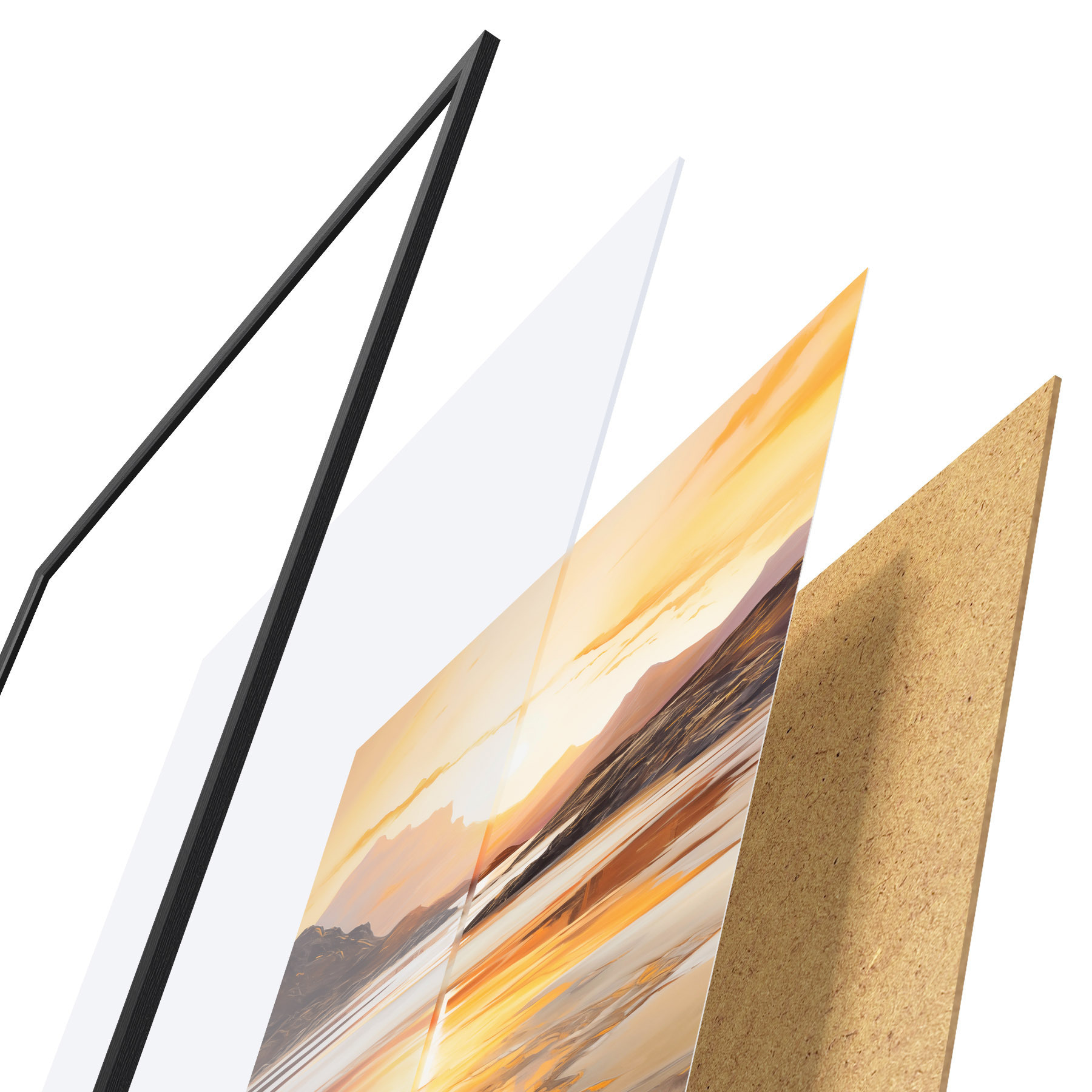 A poszter keretből, plexiből, nyomtatott képből és forgácslap hátlapból áll. A poszter a hátoldalon található rögzítőknek köszönhetően azonnal felakasztható a falra.