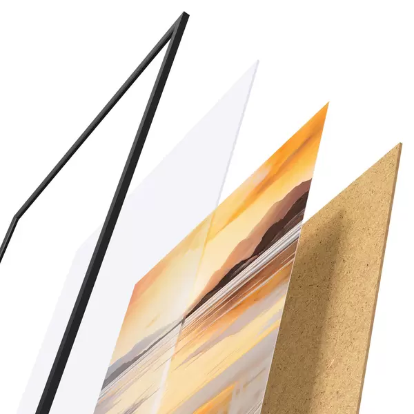 A poszter keretből, plexiből, nyomtatott képből és forgácslap hátlapból áll. A poszter a hátoldalon található rögzítőknek köszönhetően azonnal felakasztható a falra.