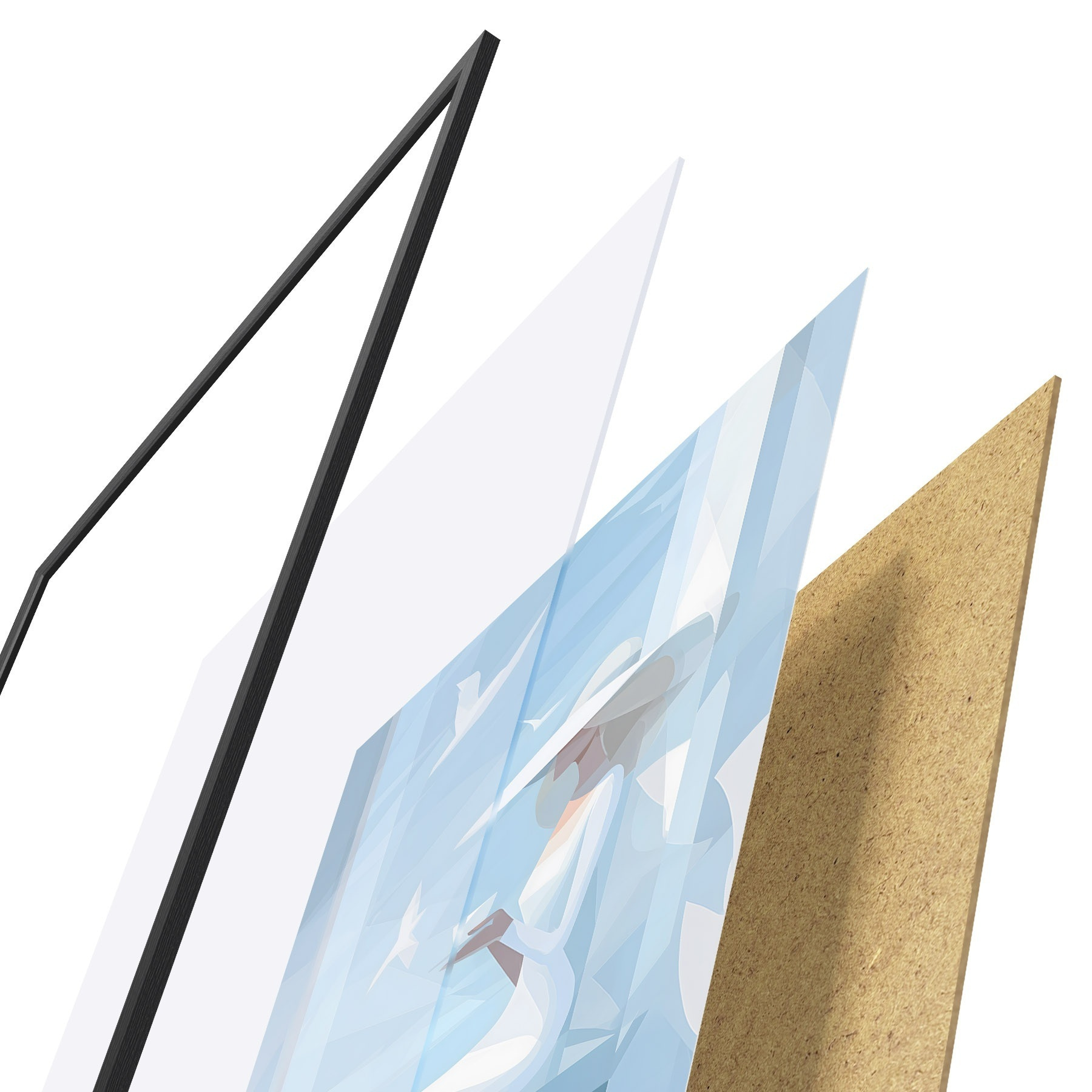 A poszter keretből, plexiből, nyomtatott képből és forgácslap hátlapból áll. A poszter a hátoldalon található rögzítőknek köszönhetően azonnal felakasztható a falra.
