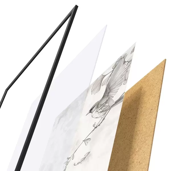 A poszter keretből, plexiből, nyomtatott képből és forgácslap hátlapból áll. A poszter a hátoldalon található rögzítőknek köszönhetően azonnal felakasztható a falra.