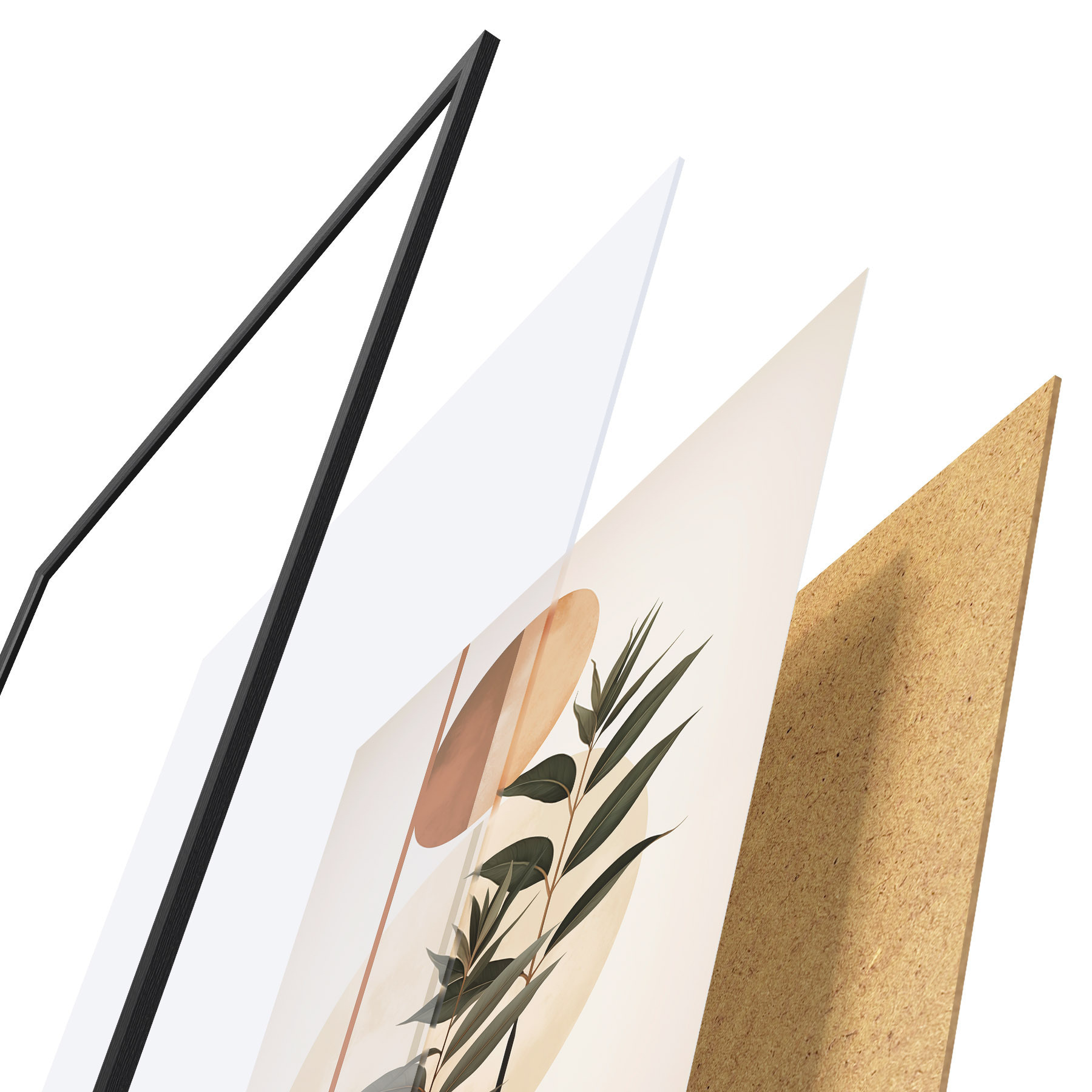 A poszter keretből, plexiből, nyomtatott képből és forgácslap hátlapból áll. A poszter a hátoldalon található rögzítőknek köszönhetően azonnal felakasztható a falra.