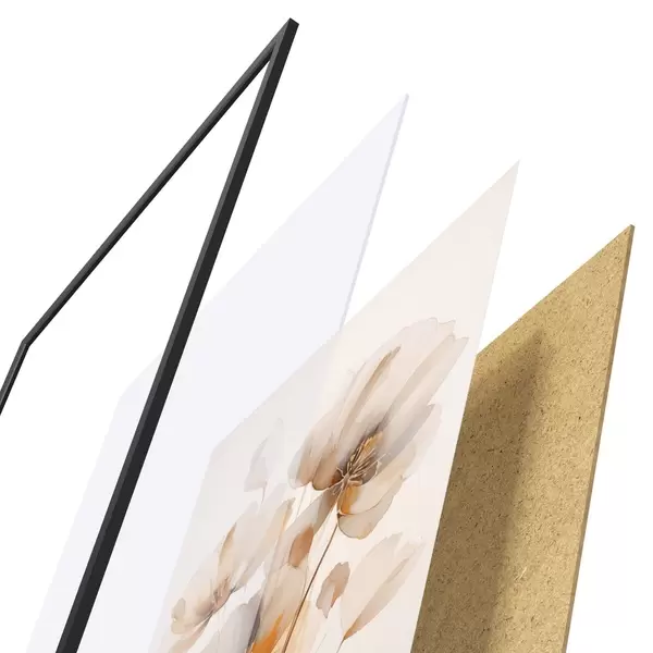 A poszter keretből, plexiből, nyomtatott képből és forgácslap hátlapból áll. A poszter a hátoldalon található rögzítőknek köszönhetően azonnal felakasztható a falra.