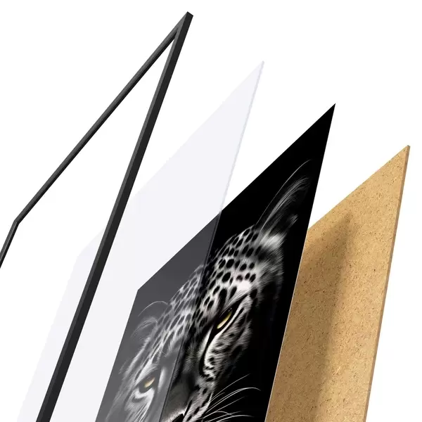 A poszter keretből, plexiből, nyomtatott képből és forgácslap hátlapból áll. A poszter a hátoldalon található rögzítőknek köszönhetően azonnal felakasztható a falra.