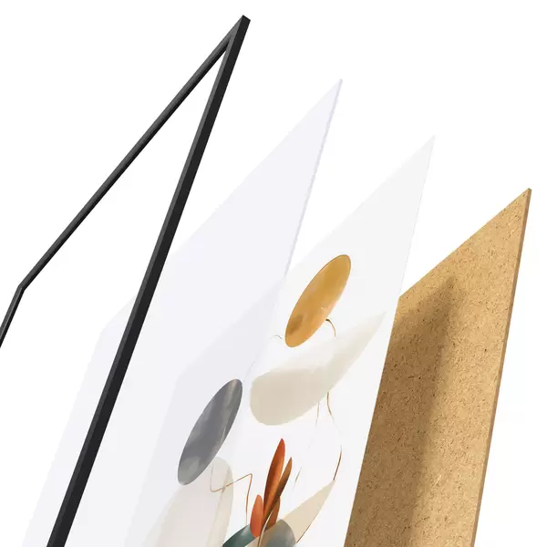 A poszter keretből, plexiből, nyomtatott képből és forgácslap hátlapból áll. A poszter a hátoldalon található rögzítőknek köszönhetően azonnal felakasztható a falra.