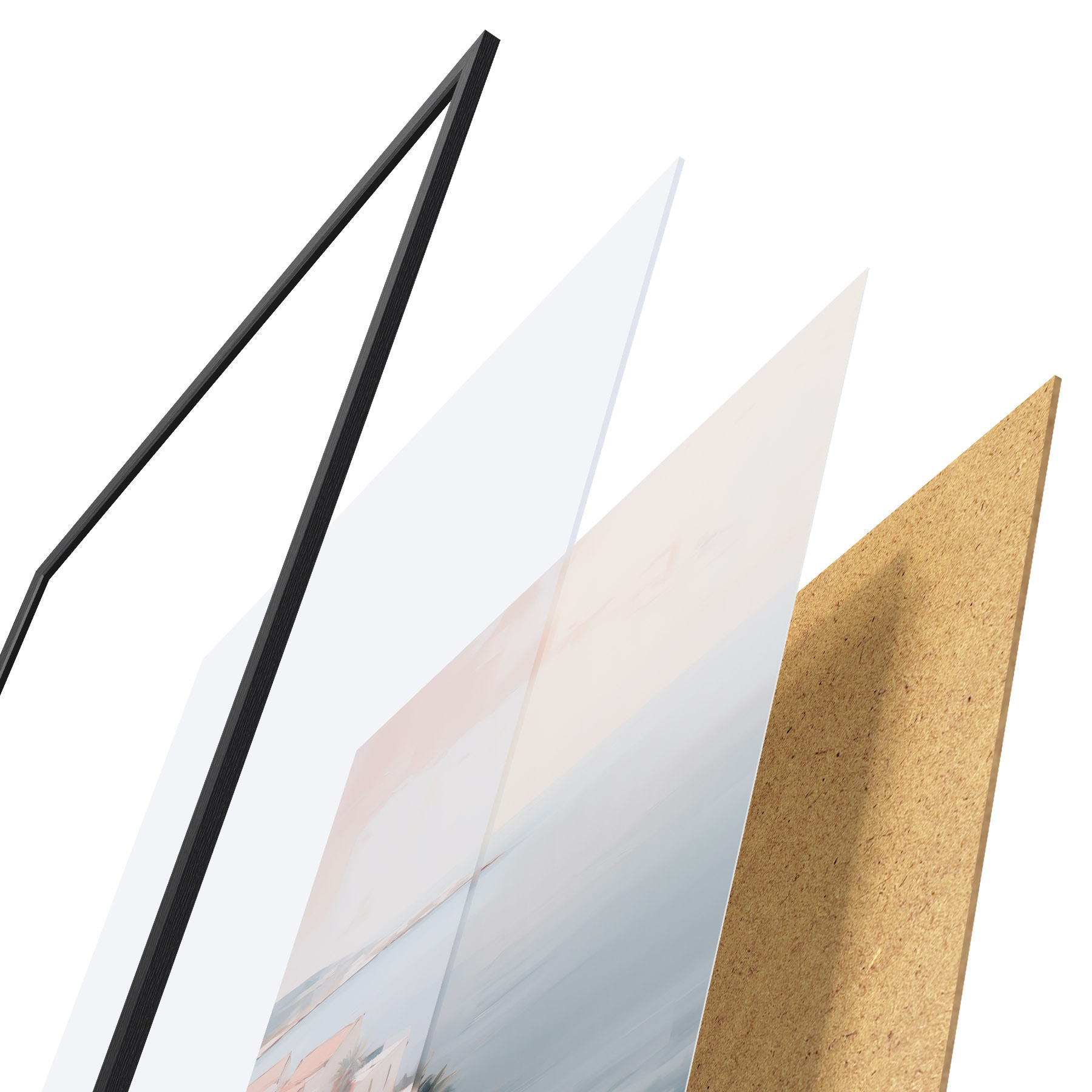 A poszter keretből, plexiből, nyomtatott képből és forgácslap hátlapból áll. A poszter a hátoldalon található rögzítőknek köszönhetően azonnal felakasztható a falra.