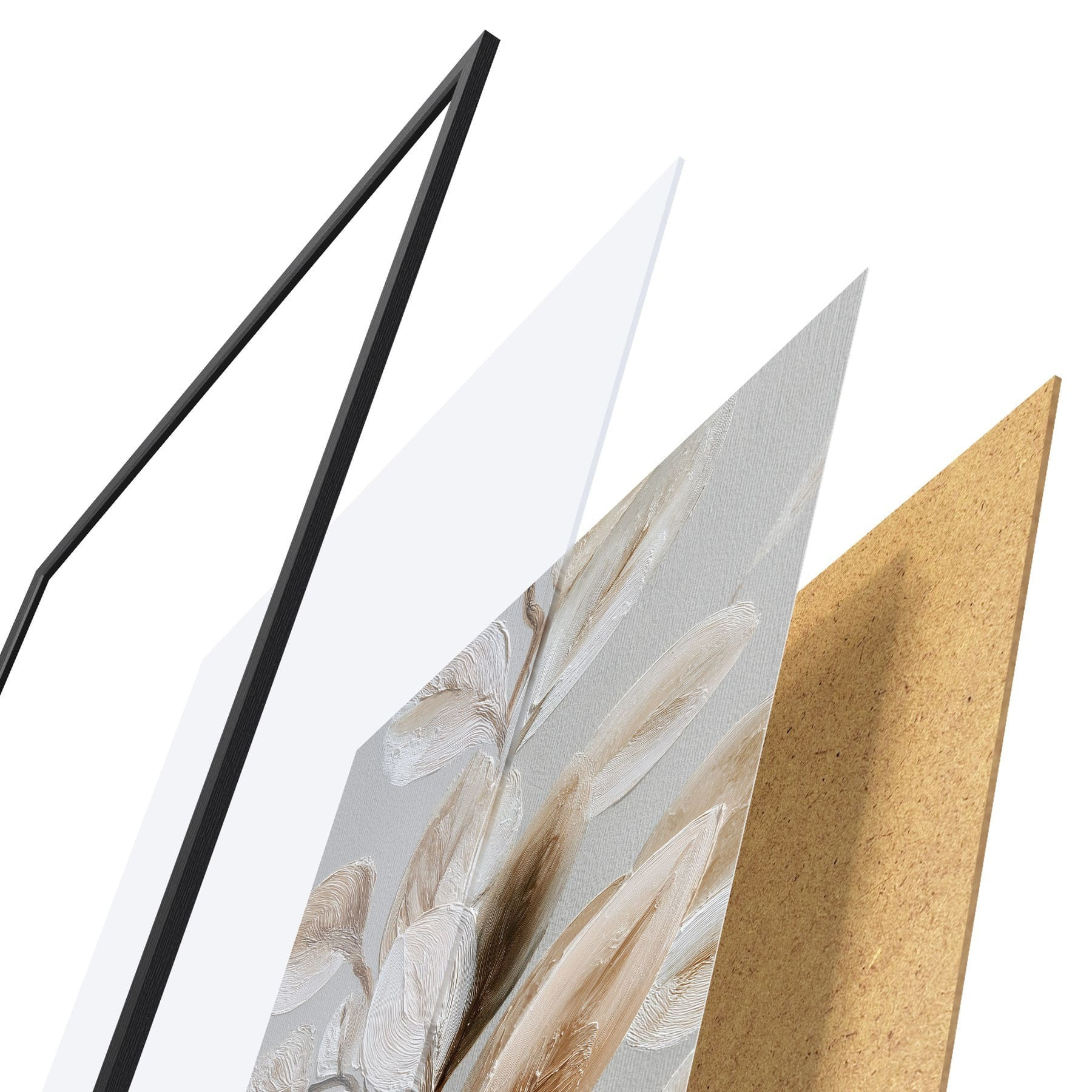 A poszter keretből, plexiből, nyomtatott képből és forgácslap hátlapból áll. A poszter a hátoldalon található rögzítőknek köszönhetően azonnal felakasztható a falra.
