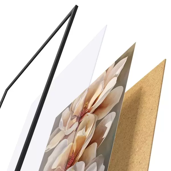 A poszter keretből, plexiből, nyomtatott képből és forgácslap hátlapból áll. A poszter a hátoldalon található rögzítőknek köszönhetően azonnal felakasztható a falra.