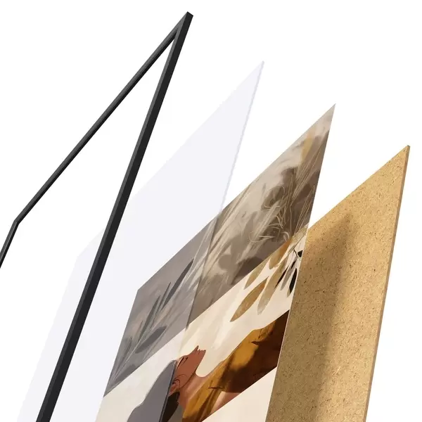 A poszter keretből, plexiből, nyomtatott képből és forgácslap hátlapból áll. A poszter a hátoldalon található rögzítőknek köszönhetően azonnal felakasztható a falra.