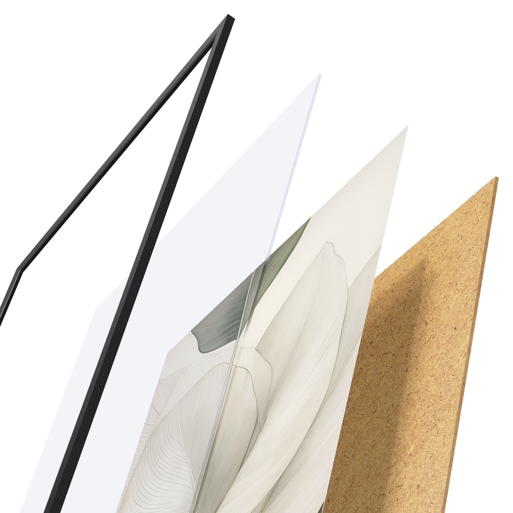 A poszter keretből, plexiből, nyomtatott képből és forgácslap hátlapból áll. A poszter a hátoldalon található rögzítőknek köszönhetően azonnal felakasztható a falra.