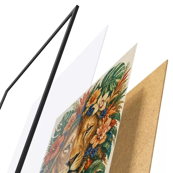A poszter keretből, plexiből, nyomtatott képből és forgácslap hátlapból áll. A poszter a hátoldalon található rögzítőknek köszönhetően azonnal felakasztható a falra.
