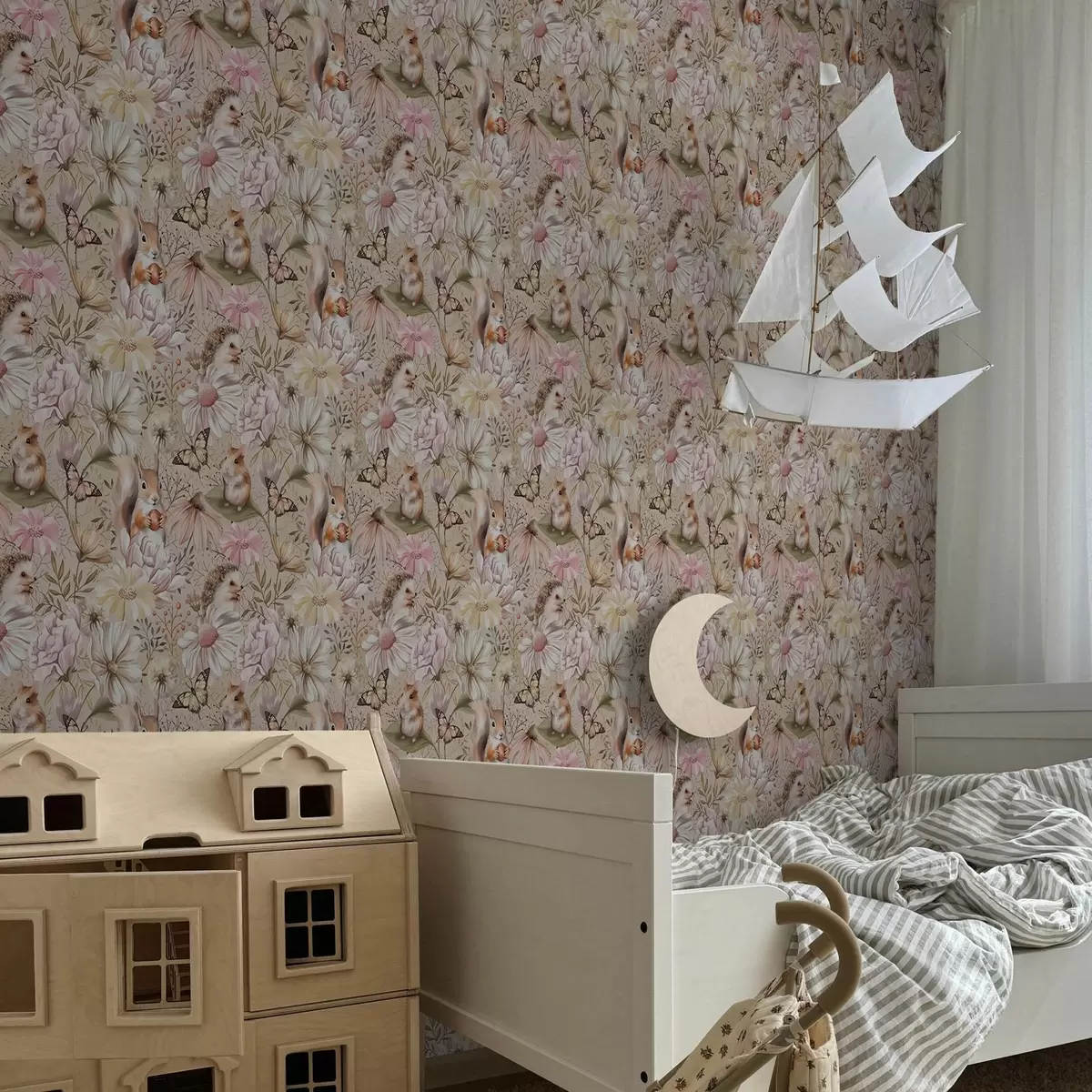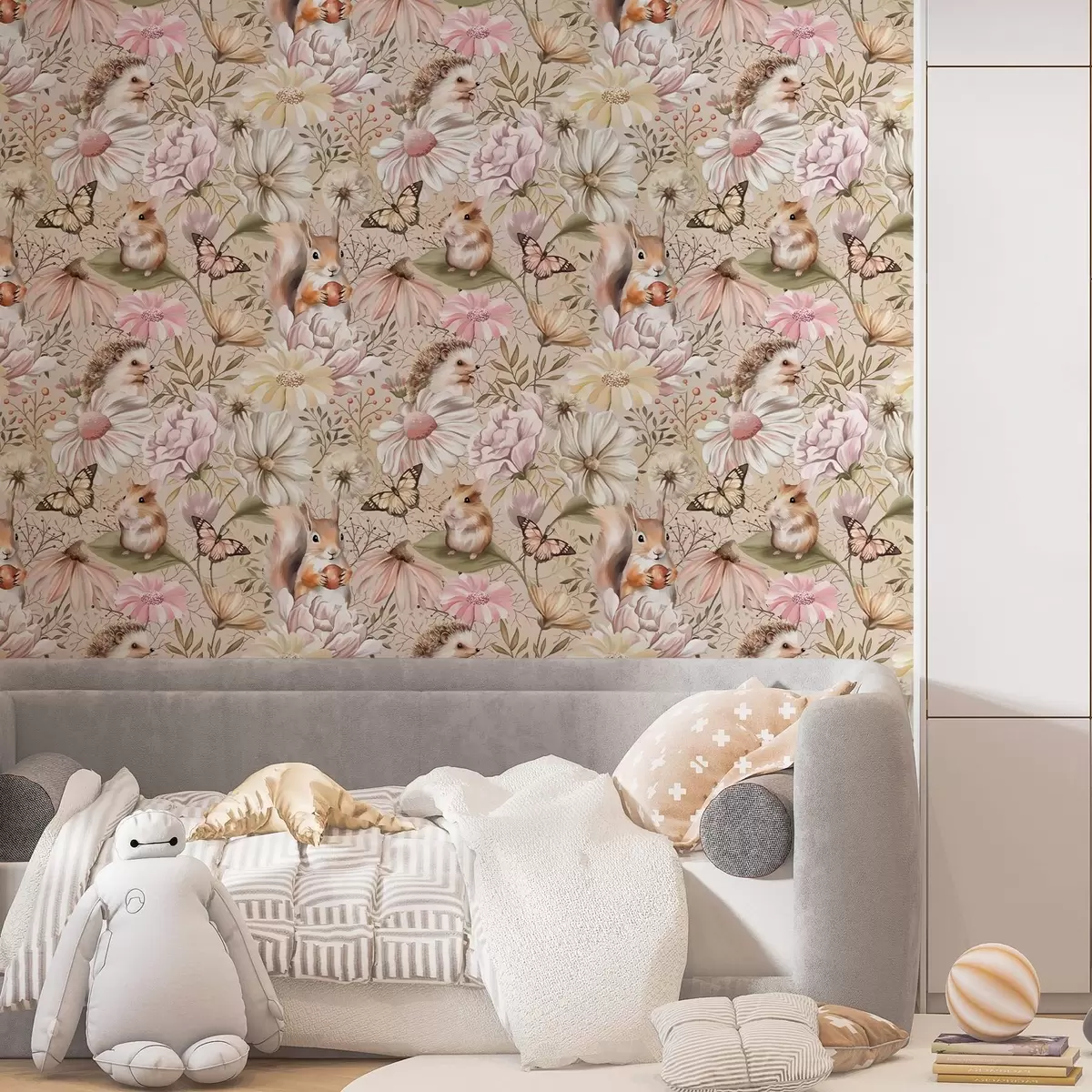 Tapéta Aranyos süni, mókus, hörcsög és pillangók virágokkal pasztell színekkel Nr. a00051