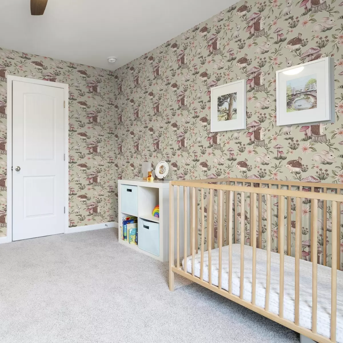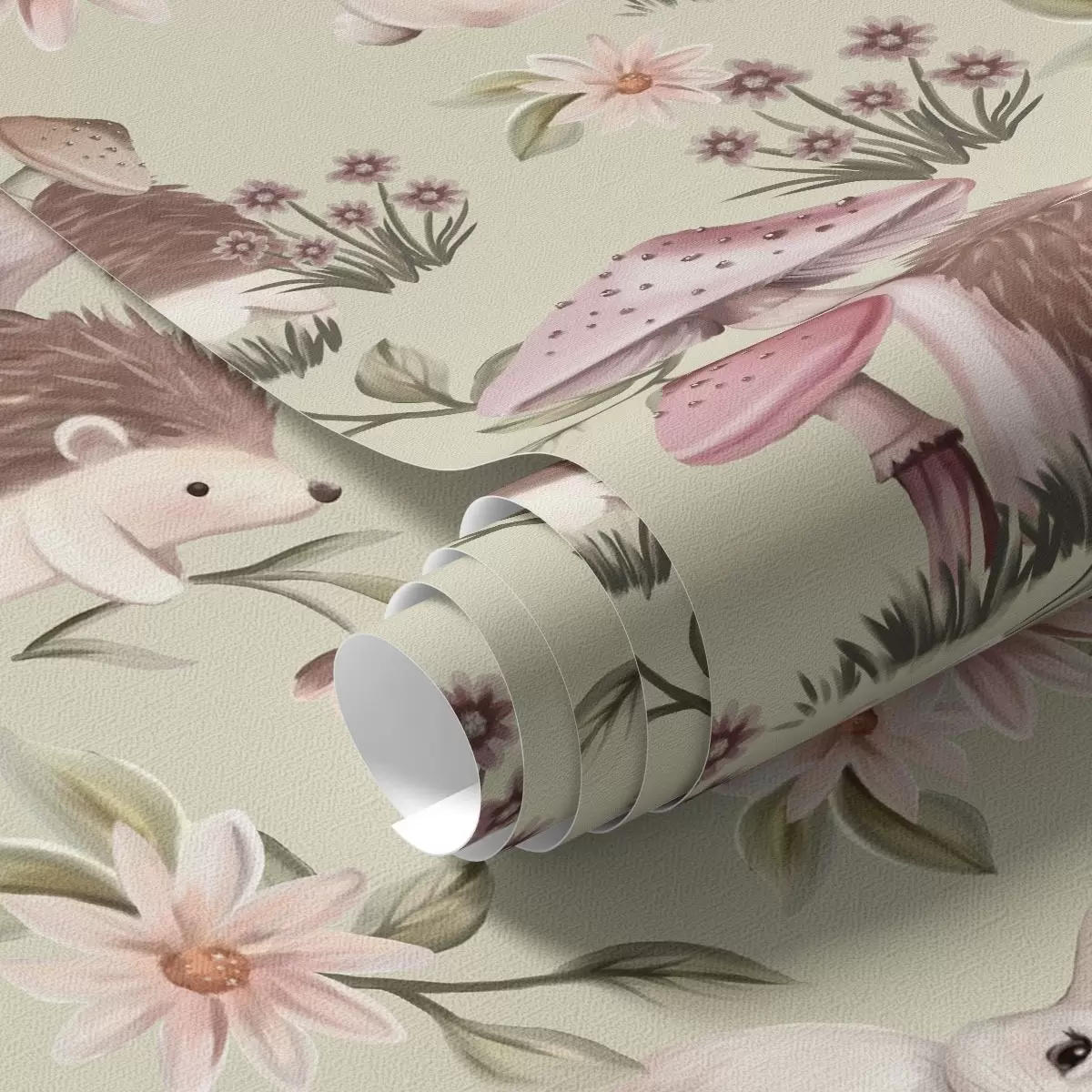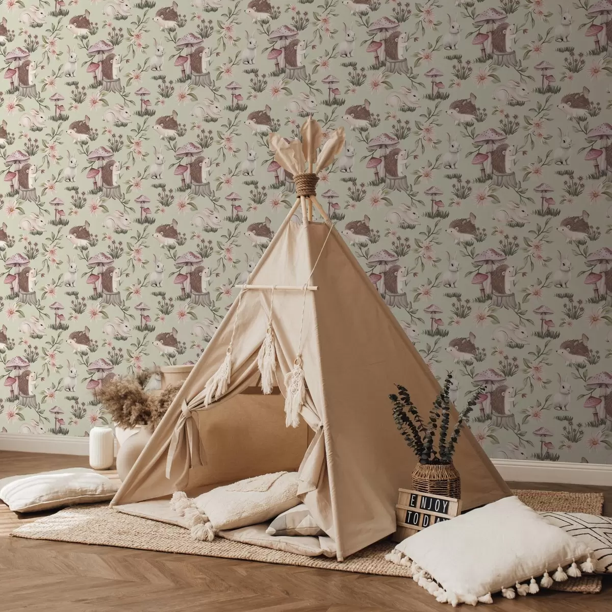 Tapéta Mesebeli állatok és virágok zöld háttéren, finom pasztellszínekben Nr. a00111v1